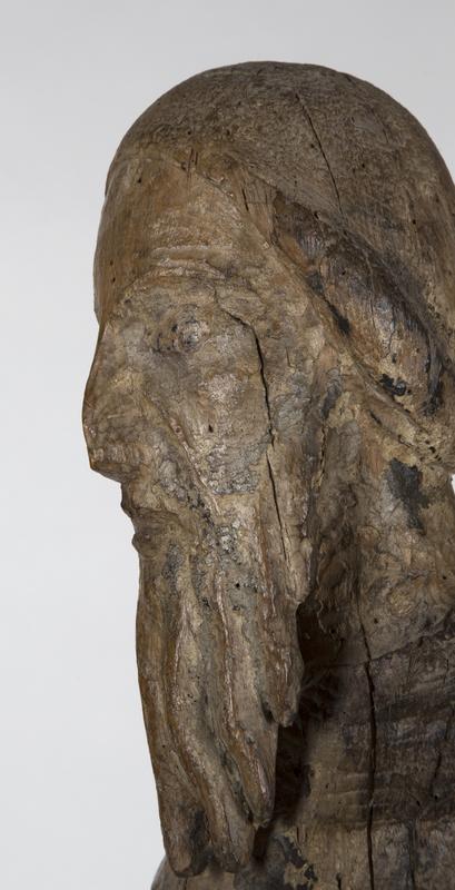 Am Kopf der Holzskulptur sind viele Spuren der einstigen Bemalung erhalten. Quelle: (Foto: Martin-von-Wagner-Museum) (idw)