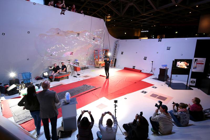 Für die ungewöhnliche Messung statteten die Wissenschaftler den Veranstaltungsraum vorab mit zahlreichen Messmarken aus. Quelle: Foto: Matthias Leitzke, phaeno (idw)