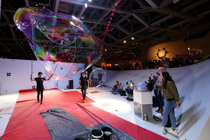 Höchste Konzentration beim Rekordversuch. Die Künstler nutzen Spezialseifenlauge, um eine möglichst große und langlebige Seifenblase zu erzeugen, die sich auch schließen lässt. Quelle: Foto: Matthias Leitzke, phaeno (idw)