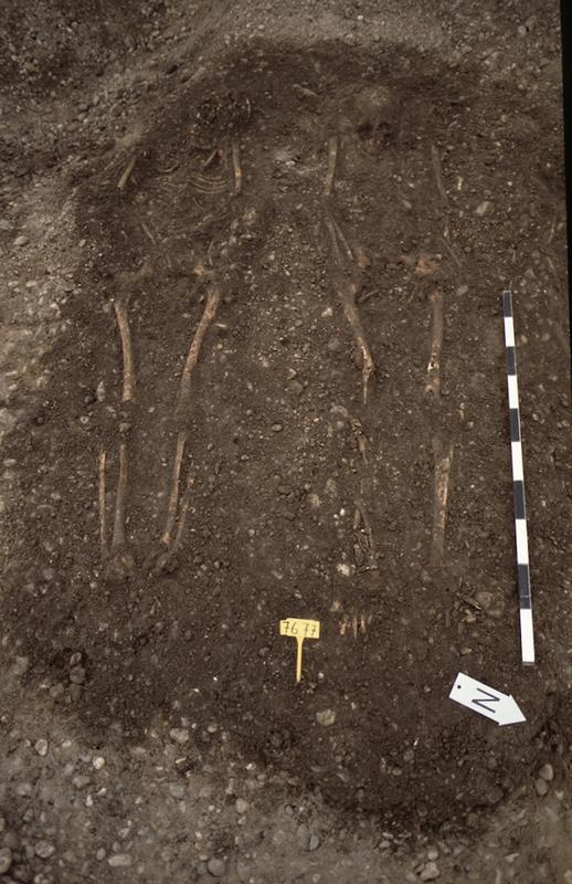 Fig. 1. „Mehrfachgrab“ aus dem 6. Jahrhundert. Aus den Zähnen solcher Skelette konnten Wissenschaftl Quelle: Foto: © H-P. Volpert (idw)