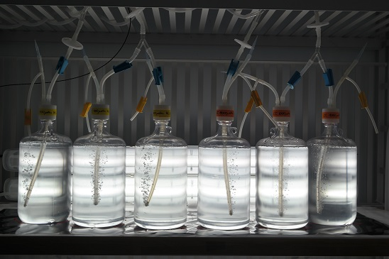 Versuchsaufbau: Die einzelligen Algen werden bei verschiedenen Kohlendioxidgehalten und Lichtintensitäten gehältert.