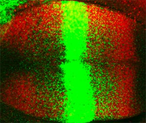 Dpp-Gradient im sich entwickelnden Flügel der Fruchtfliege. Das mit einem grün leuchtenden Protein markierte GFP-Dpp ist als vertikaler Streifen im Zentrum des Flügels zu sehen, es bildet einen Konzentrationsgradienten auf beiden Seiten dieser Quelle. Rot gekennzeichnet sind die Domänen, in denen als Reaktion auf den Dpp-Gradienten das Gen Spalt exprimiert wird. Bild: MPI-CBG, Marcos González-Gaitán