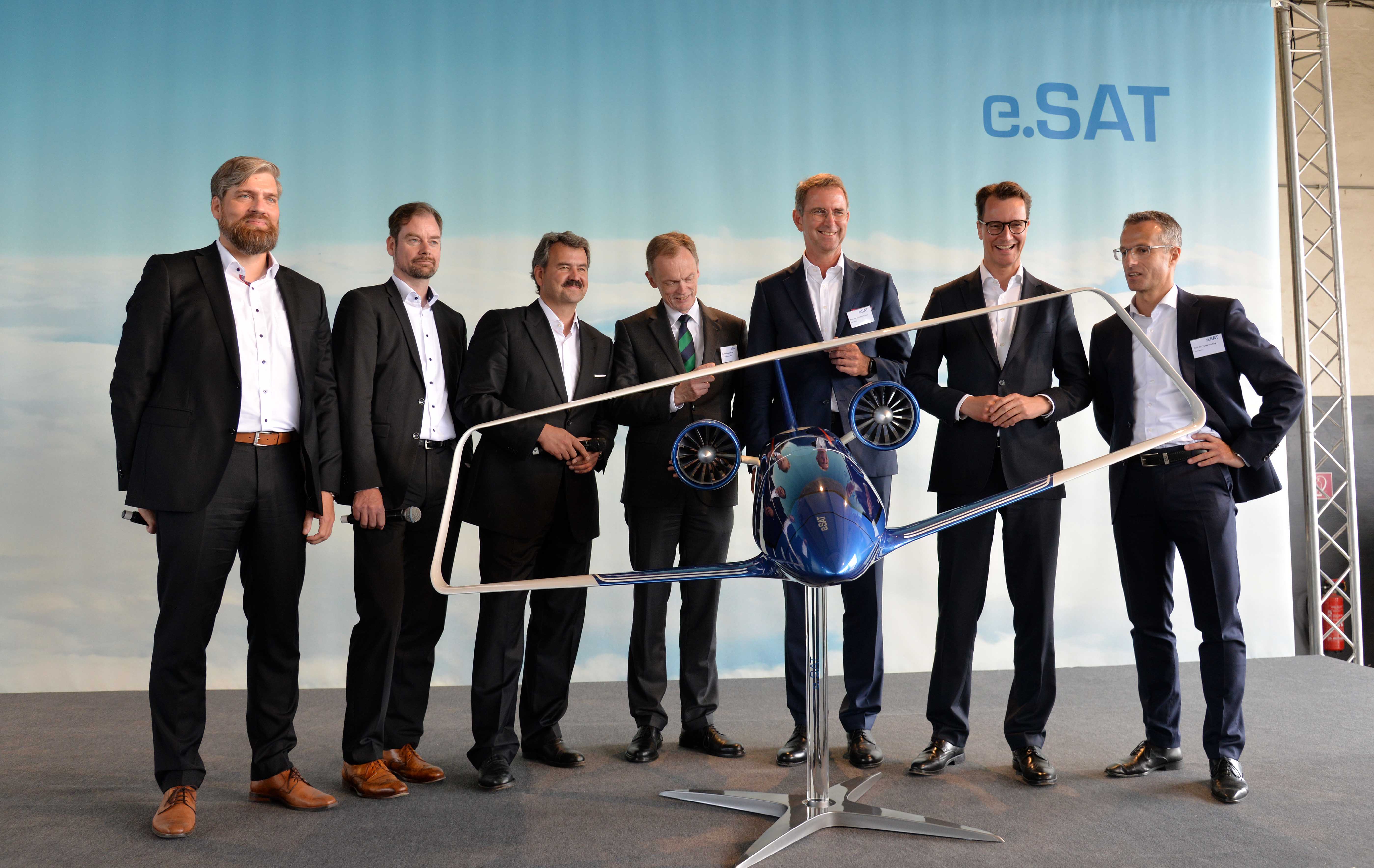 V.l.n.r.: Prof. Dr. Kai-Uwe Schröder (e.SAT GmbH), Prof. Dr. Eike Stumpf (e.SAT GmbH), Prof. Dr. Frank Janser (e.SAT GmbH), Dr. Hendrik Schulte (Staatssekretär, Ministerium für Verkehr des Landes Nordrhein-Westfalen), Prof. Dr. Günther Schuh (e.SAT GmbH), Hendrik Wüst (Minister für Verkehr des Landes Nordrhein-Westfalen) und Prof. Dr. Peter Jeschke (e.SAT GmbH)