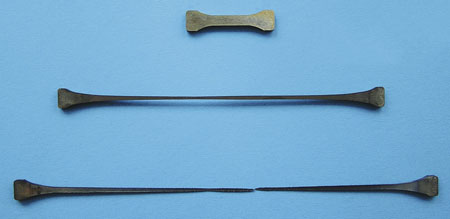 Dehnbar wie Gummi: Sehr feine und gleichmäßige Körnchen (Kristallite) verleihen neuen Stählen "Superplastizität". Oben das ursprüngliche Werkstück, in der Mitte eine Gleichmaßdehnung um 850, unten die Bruchdehnung um 1025 Prozent. Bild: MaxPlanckForschung/MPI für Eisenforschung