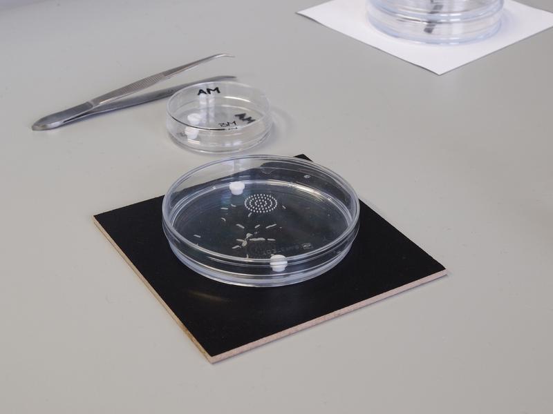 Die Larven in der Petrischale bewegen sich zu einem der beiden Düfte, die sich in den kleinen, weißen Containern befinden. Quelle: LIN (idw)