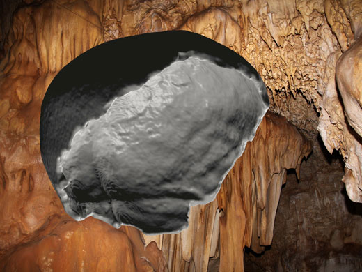 Die computertomographische Version des Manot Fundes und die Manot-Höhle im Hintergrund. Quelle: Copyright: Gerhard Weber (idw)