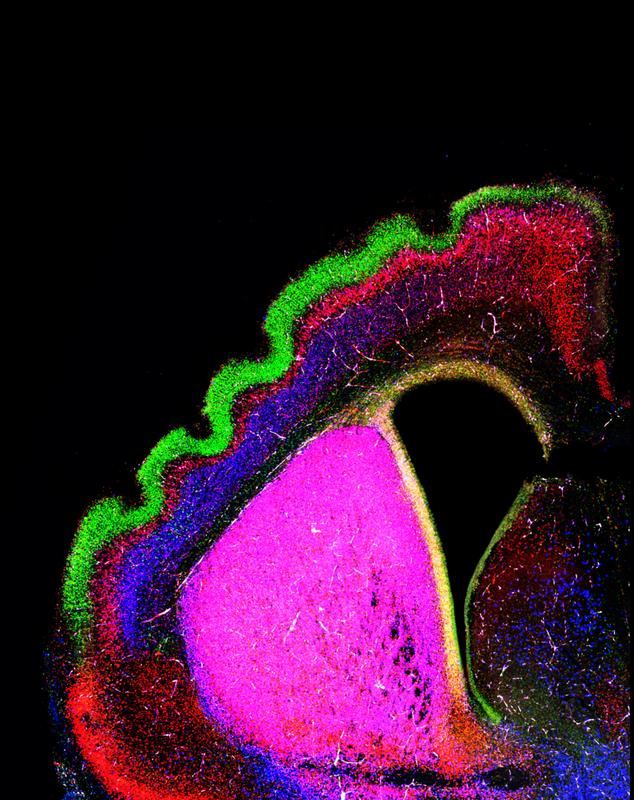 Ohne Adhäsions-Moleküle der FLRT-Familie bildet die normalerweise glatte Hirnrinde der Maus Falten aus, die in Aufbau und Struktur dem menschlichen Gehirn entsprechen. Quelle: MPI für Neurobiologie / del Toro, Cederfjäll (idw)