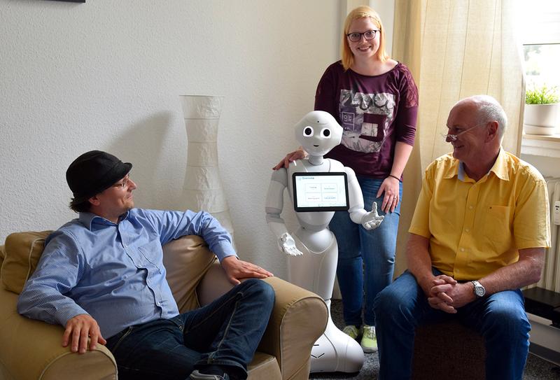 Sebastian Hofheinz, Studentin Jennifer Blazejak und Dr. Rainer Wieching zusammen mit Pepper im Forschungswohnzimmer (v.l.) Quelle: Universität Siegen (idw)