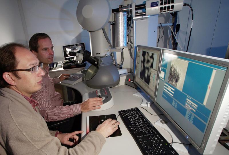 An einem neuen Transmissionselektronenmikroskop arbeiten die Mineralogen Prof. Dr. Falko Langenhorst Quelle: Foto: Jan-Peter Kasper/FSU (idw)