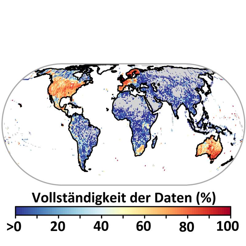 Wissenslücken zur weltweiten Verbreitung von Arten: Wärmere Farben zeigen Gebiete, in denen die meisten Arten mit Verbreitungsdaten abgedeckt sind. Für graue Bereiche gibt es gar keine Daten. Quelle: Foto: Universität Göttingen (idw)
