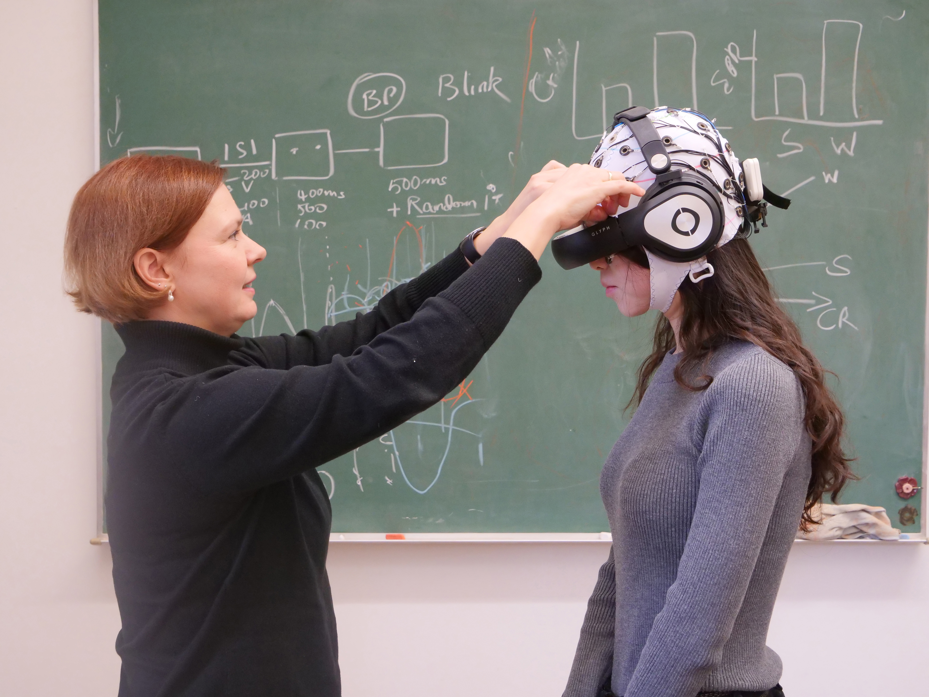 Mit dieser technischen Ausrüstung erforscht Dr. Barbara Händel (l.), wie sich Bewegung auf die Verarbeitung visueller Reize auswirkt. Quelle: (Foto: Robert Emmerich / Universität Würzburg) (idw)
