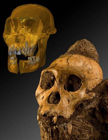 Schädelrekonstruktion (im Hintergrund) und Originalschädel von MH1.
