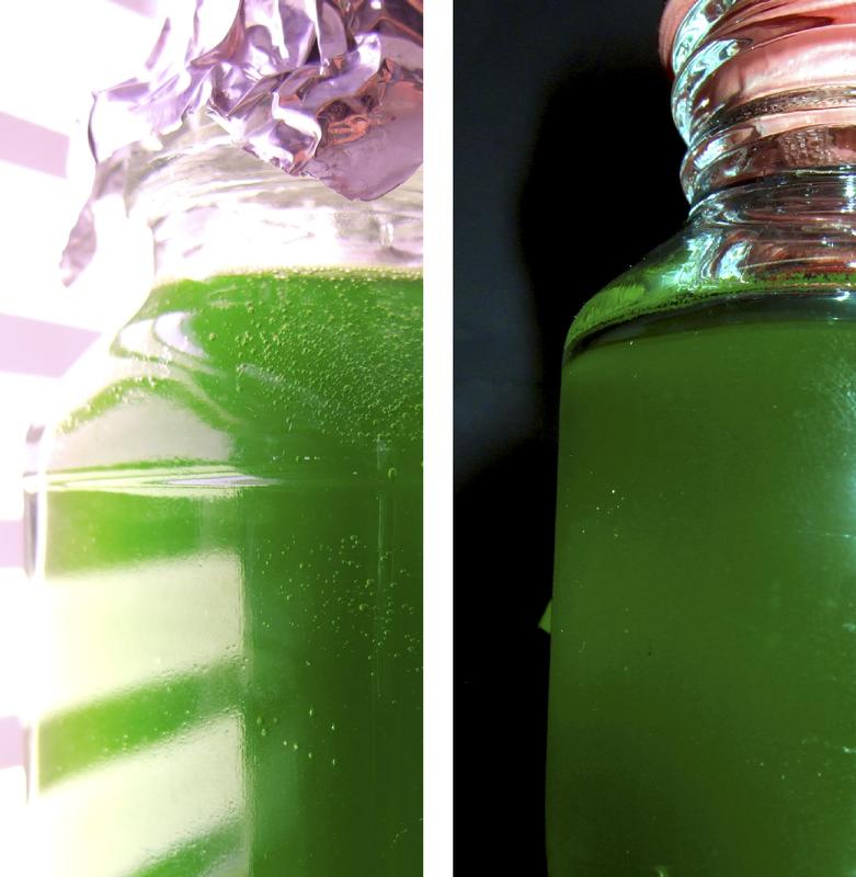 Grünalgen im Licht (links) und in luftdicht verschlossenen Flaschen im Dunkeln (rechts). Quelle: © RUB, Foto: AG Photobiotechnologie (idw)