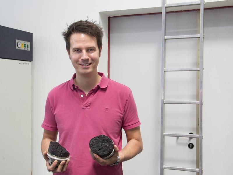 Bernhard Hofko mit Asphaltproben Quelle: TU Wien (idw)