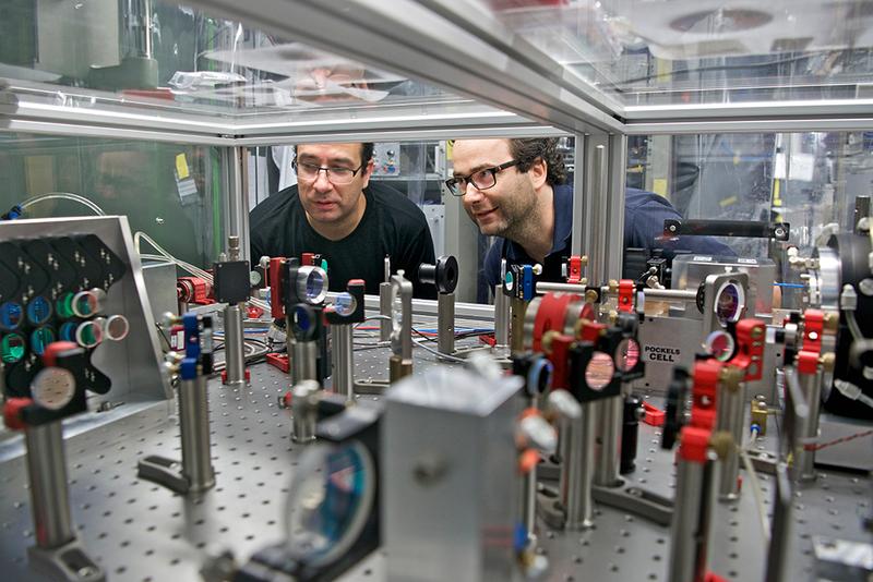 Karsten Schuhmann und Aldo Antognini an dem Lasersystem, das für die Laserspektroskopie eingesetzt wurde. Quelle: Foto: Paul Scherrer Institut/Markus Fischer (idw)
