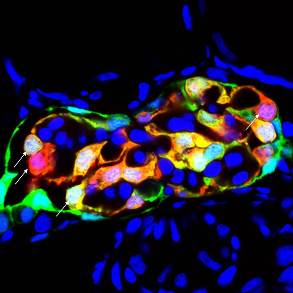 Podozyten (blau), die Füßchenzellen der Niere, sitzen auf der Kapillare und wandern nicht auf ihr entlang. Quelle: Foto: Florian Siegerist (idw)