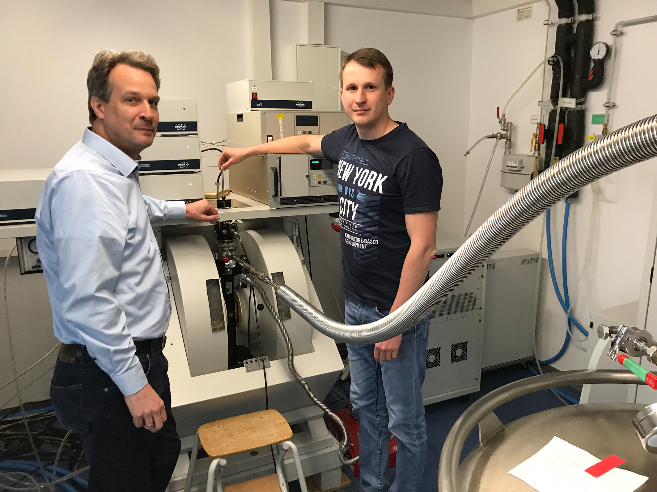 Prof. Dr. Olav Schiemann (links) und Dr. Dinar Abdullin an der Messapparatur im Institut für Physikalische und Theoretische Chemie der Universität Bonn. Quelle: © Foto: PD Dr. Gregor Hagelueken/Uni Bonn (idw)