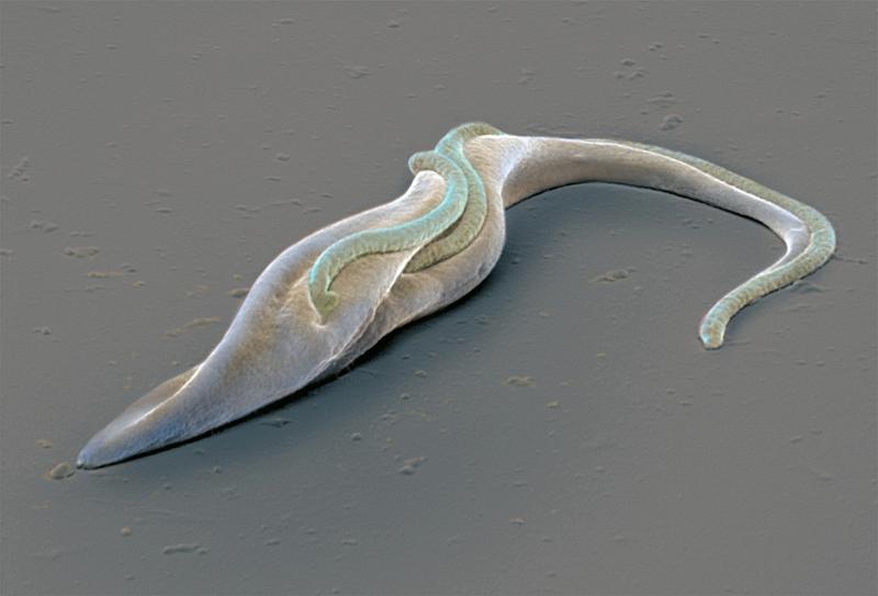 Rasterelektronenmikroskopische Aufnahme eines Trypanosoms. Quelle: Dr. Christopher Jackson - IKELOS. (idw)