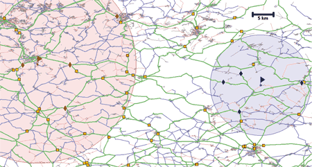 Um sich in diesem Wirrwarr zurecht zu finden, helfen einem Routenplaner jetzt Orientierungspunkte. Künftig ermittelt er den kürzesten Weg zwischen Start und Ziel (Fähnchen) mit Hilfe vorberechneter Informationen zu den nächstgelegen Transitknoten (Rauten). Bild: Max-Planck-Institut für Informatik / Universität Karlsruhe