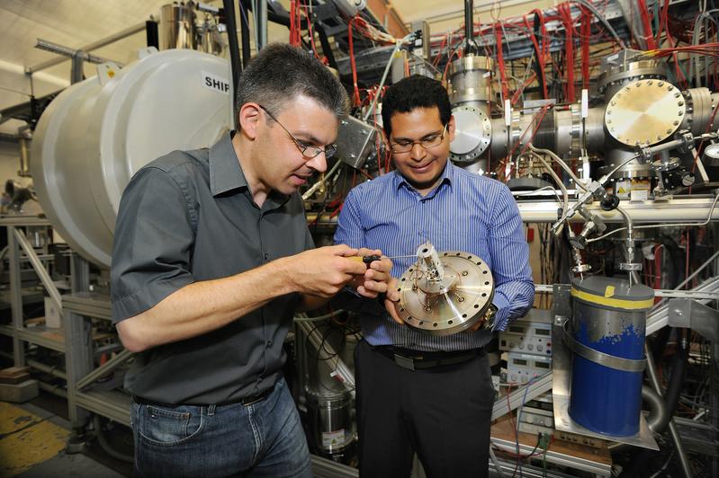 Enrique Minaya Ramirez (r.) und Michael Block mit dem ausgebauten Ionendetektor von Shiptrap. Quelle: Foto: G.Otto / GSI (idw)