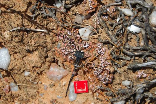 Der neu entwickelte Bodenfeuchtesensor im Einsatz in einer durch Flechten dominierten Bodenkruste in der Sukkulentenkaroo, einer Halbwüste in Südafrika. Quelle: Bettina Weber, MPI für Chemie (idw)