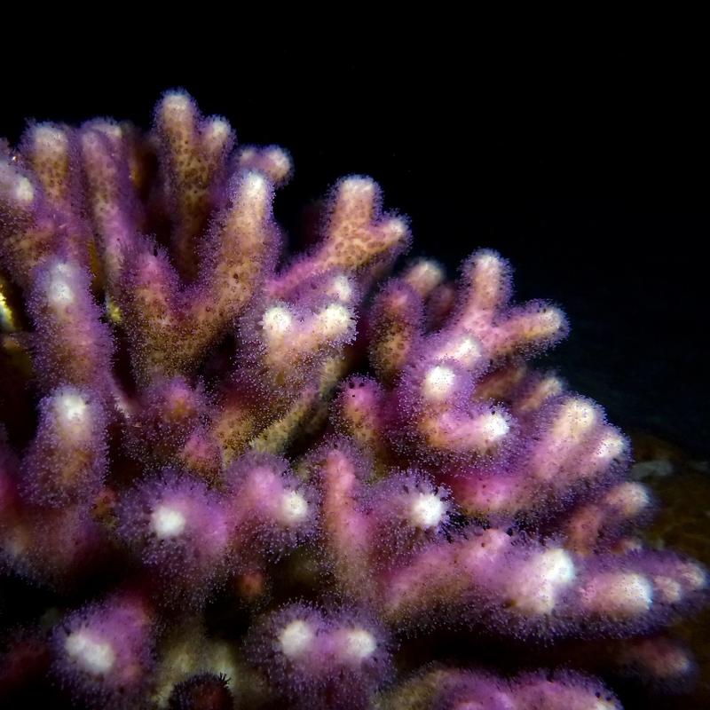 Eine der untersuchten Korallenarten (die Griffelkoralle Stylophora) mit geöffneten Polypententakeln bei Nacht Quelle: "Foto: Dr. Ulisse Cardini" (idw)