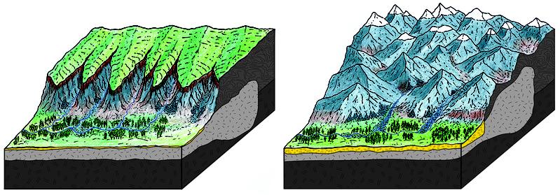 Quellgebiet der Ur-Reuss vor ca. 30 Mio. Jahren (links), das sich vor ca. 25 Mio. Jahren in eine Landschaft mit steilen Tälern und Bergstürzen wandelte und aus der Ur-Reuss einen Wildbach machte. Quelle: © Philippos Garefalakis, Universität Bern (idw)