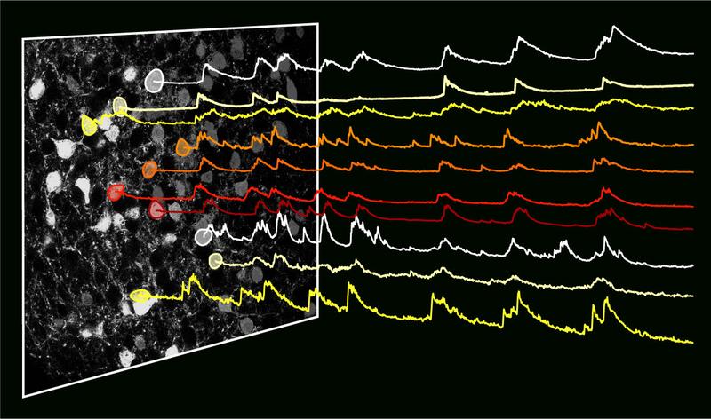 Nervenzellen vom Typ HTR2a in der Amygdala der Maus sind während des Essens aktiv (Ausschläge in den Aktivitätskurven), wodurch die Nahrungsaufnahme gefördert wird. Quelle: © MPI für Neurobiologie / Douglass & Kucukdereli (idw)