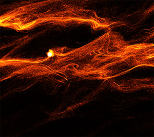 Geburt in der Urwolke: Der Ausschnitt der zirkumstellaren Scheibe zeigt, dass sich an der hellen Stelle so viel Materie ansammelt, dass ein lokaler Kollaps einsetzt. Diese Verdichtung bleibt in der turbulenten Strömung stabil und fängt mit der Zeit immer mehr Materie aus der Scheibe ein. Schließlich bildet sich ein Miniplanet, der später mit vielen anderen zusammenstößt und einen großen Planeten bildet. Bild: Max-Planck-Institut für Astronomie