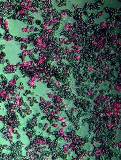 Braune Fettzellen in Kultur. In den rosa gefärbten Zellen wurde das Sufu-Gen blockiert. Abbildung: IMBA