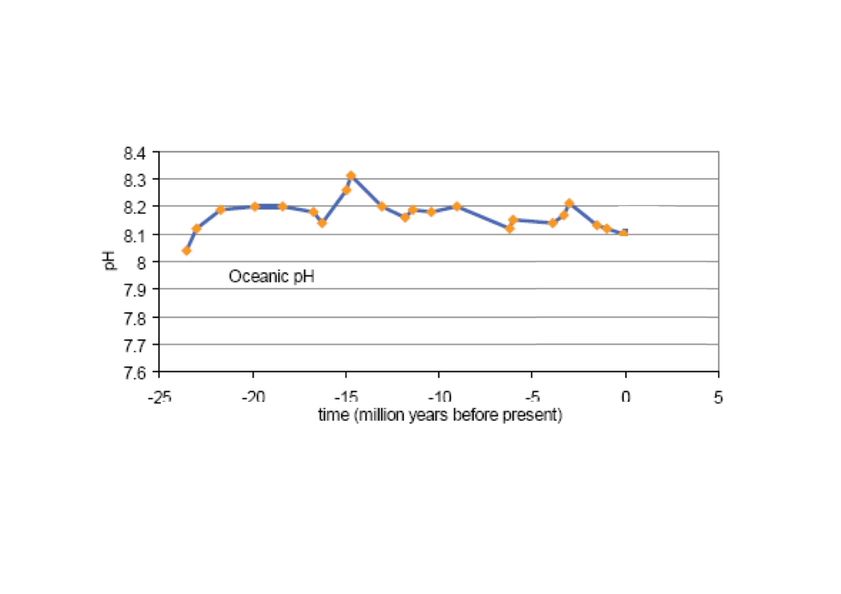 Abbildung 8 zeigt die Entwicklung des gemittelten ozeanischen pH-Wertes im Neogen, vor 23 Millionen Jahren bis heute. Grafik: EIKE