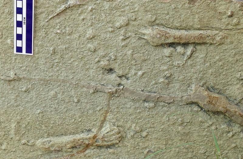 Handabdrücke von azhdharchiden Flugsauriern in einem Sandstein der spätesten Kreidezeit. Fundort: RaQuelle: Bild: Wolfgang Stinnesbeck (idw)