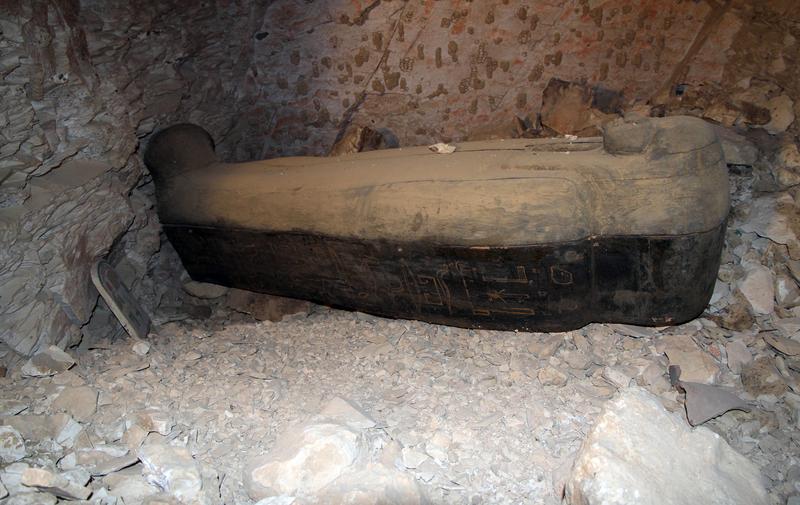 Unberührtes Grab: Hölzernen Sarkophag, der die Mumie einer Frau namens Nehemes-Bastet enthält. Quelle: Bild: Universität Basel (idw)