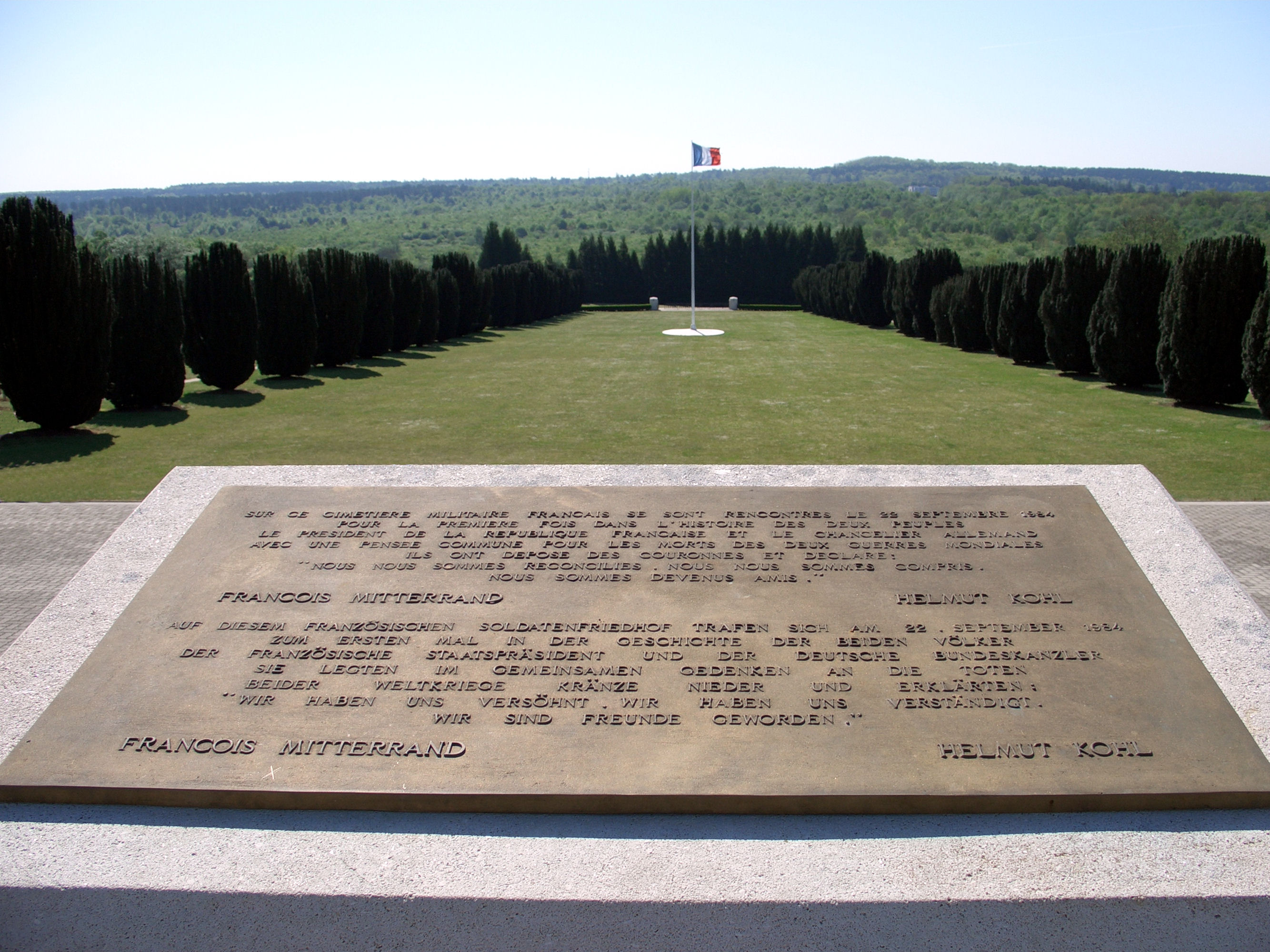 Gedenkplatte vor dem Beinhaus von Douaumont in Erinnerung an das Treffen zwischen François Mitterrand und Helmut Kohl im Jahr 1984