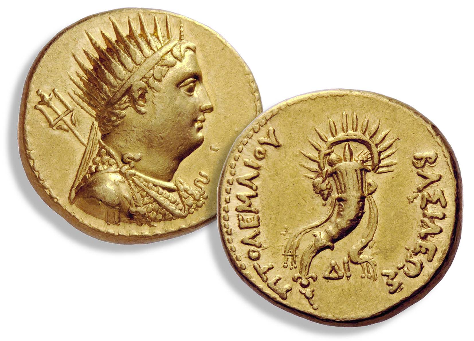 Goldmünze mit dem Porträt Ptomemaios' III. und einem Füllhorn aus der 2. Hälfte des 3. Jahrhunderts v. Chr. Quelle: © Numismatische Bilddatenbank Eichstätt (NBE)/Jürgen Malitz (idw)