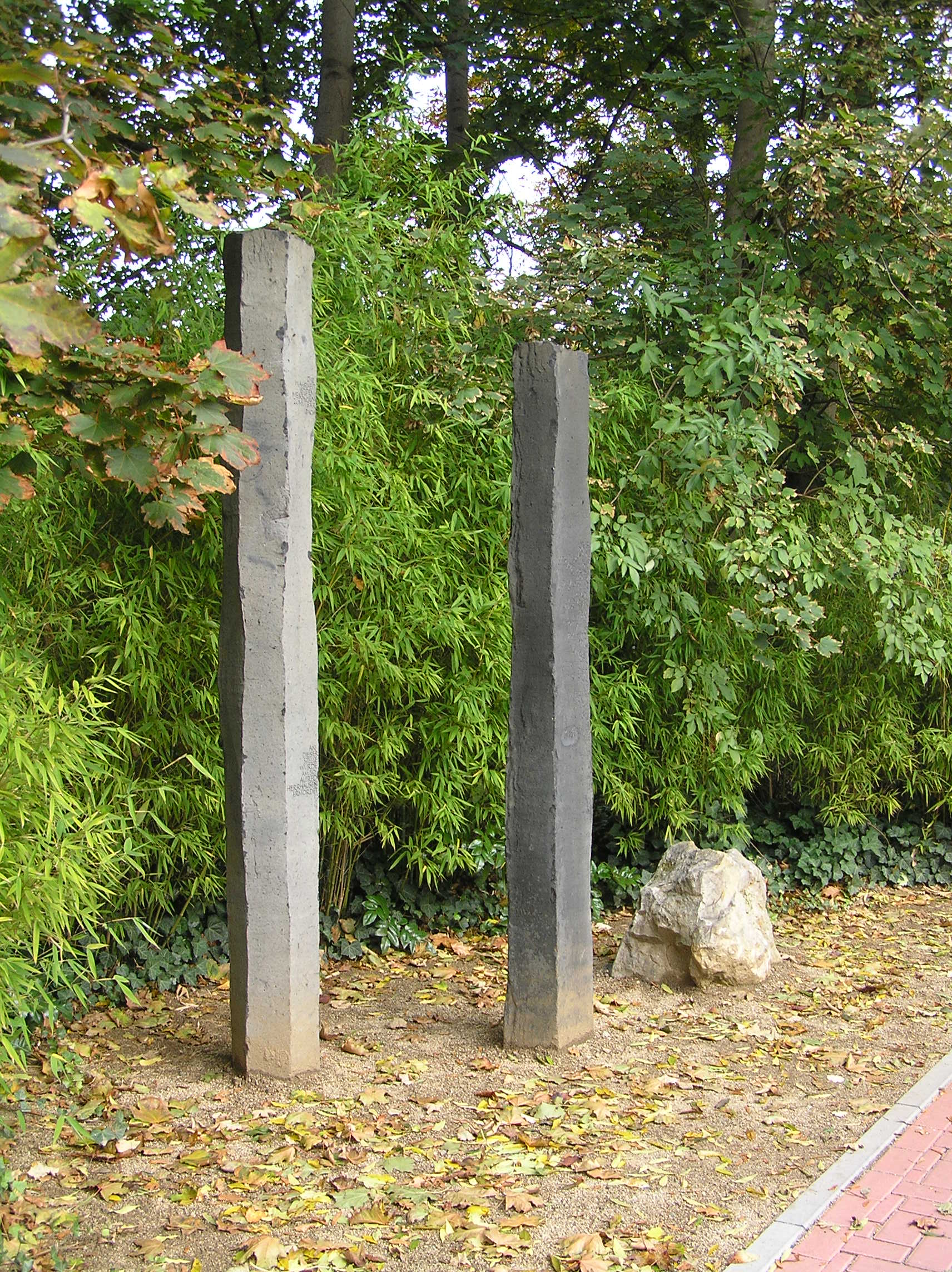 Denkmal an der Stelle der Ermordung; in eine der Stelen ist ein Satz von Ingeborg Bachmann eingraviert: „Die Wahrheit ist dem Menschen zumutbar“, eine Erkenntnis, die die Lebenseinstellung Herrhausens gut zusammenfasst