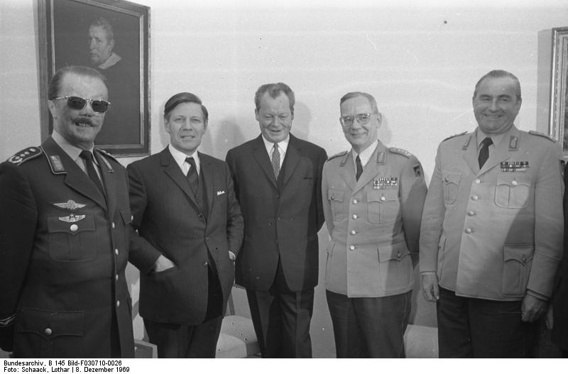 Verteidigungsminister Schmidt (zweiter von links) auf einer Begegnung von Brandt mit der Bundeswehrführung, 1969 (links: Johannes Steinhoff, rechts neben Brandt: Ulrich de Maizière).
