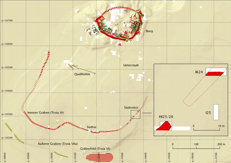 Troia - Grabungsareale 2009 und spätbronzezeitliche Verteidigungsgräben Plan: Universität Tübingen