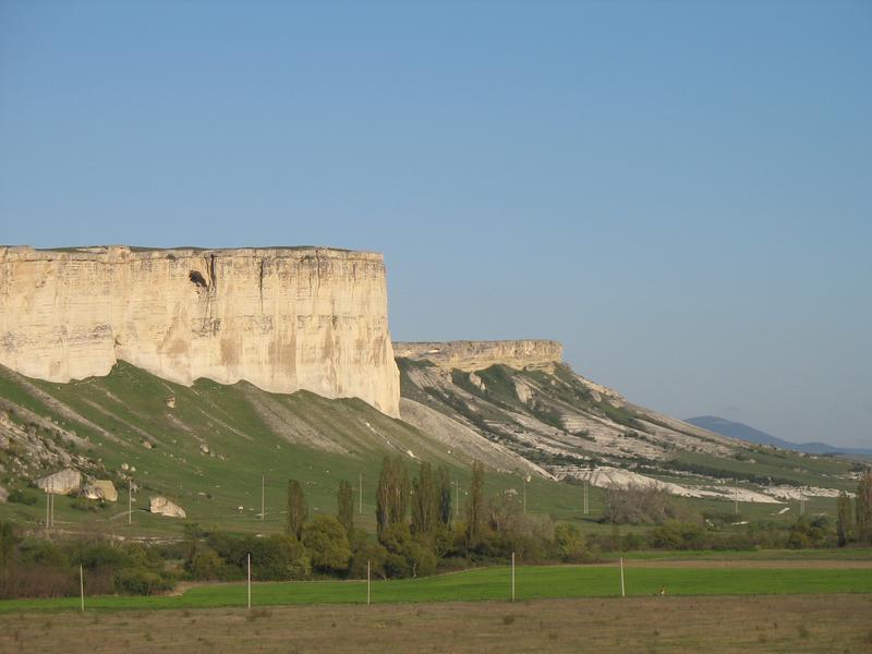 Blick auf den Ak-Kaya-Felsen. Die von den späten Neandertalern genutzten Felschutzdächer befinden sich knapp unterhalb der Hochfläche und sind heute von Hangschutt bedeckt.