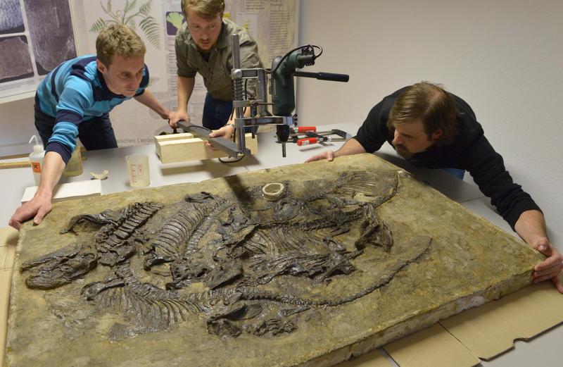 Frederik Spindler (2.v.l.), Paläontologe an der TU Bergakademie Freiberg und Christen Shelton vom Steinmann-Institut Bonn entnehmen Proben aus der Saurierplatte