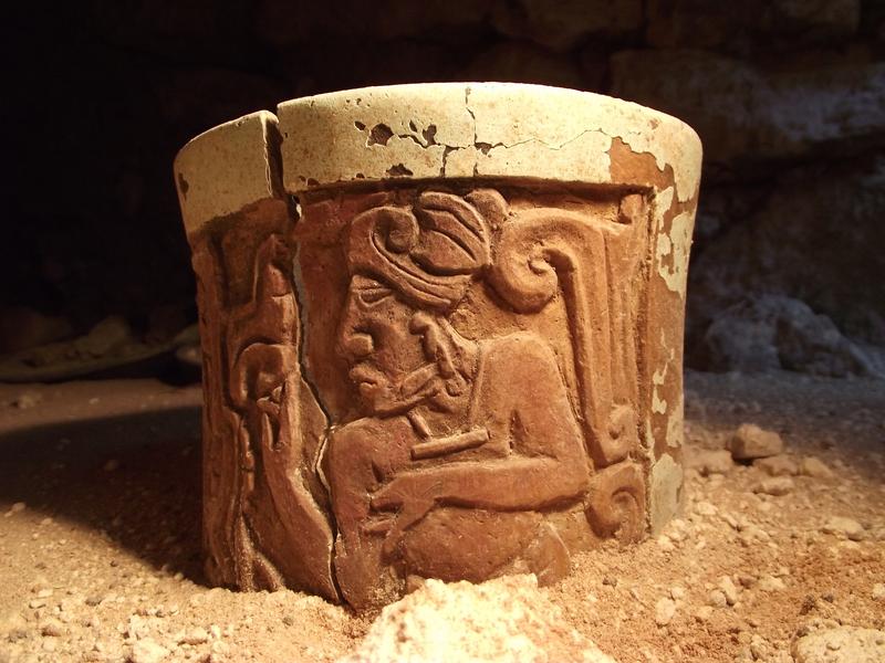 Eines der reliefverzierten Keramikgefäße, das als Kakaobecher diente mit der Darstellung eines jungen Mannes. Kakao war das Getränk des Adels in der Maya-Gesellschaft. Quelle: Foto: Archäologisches Projekt Uxul/Universität Bonn (idw)