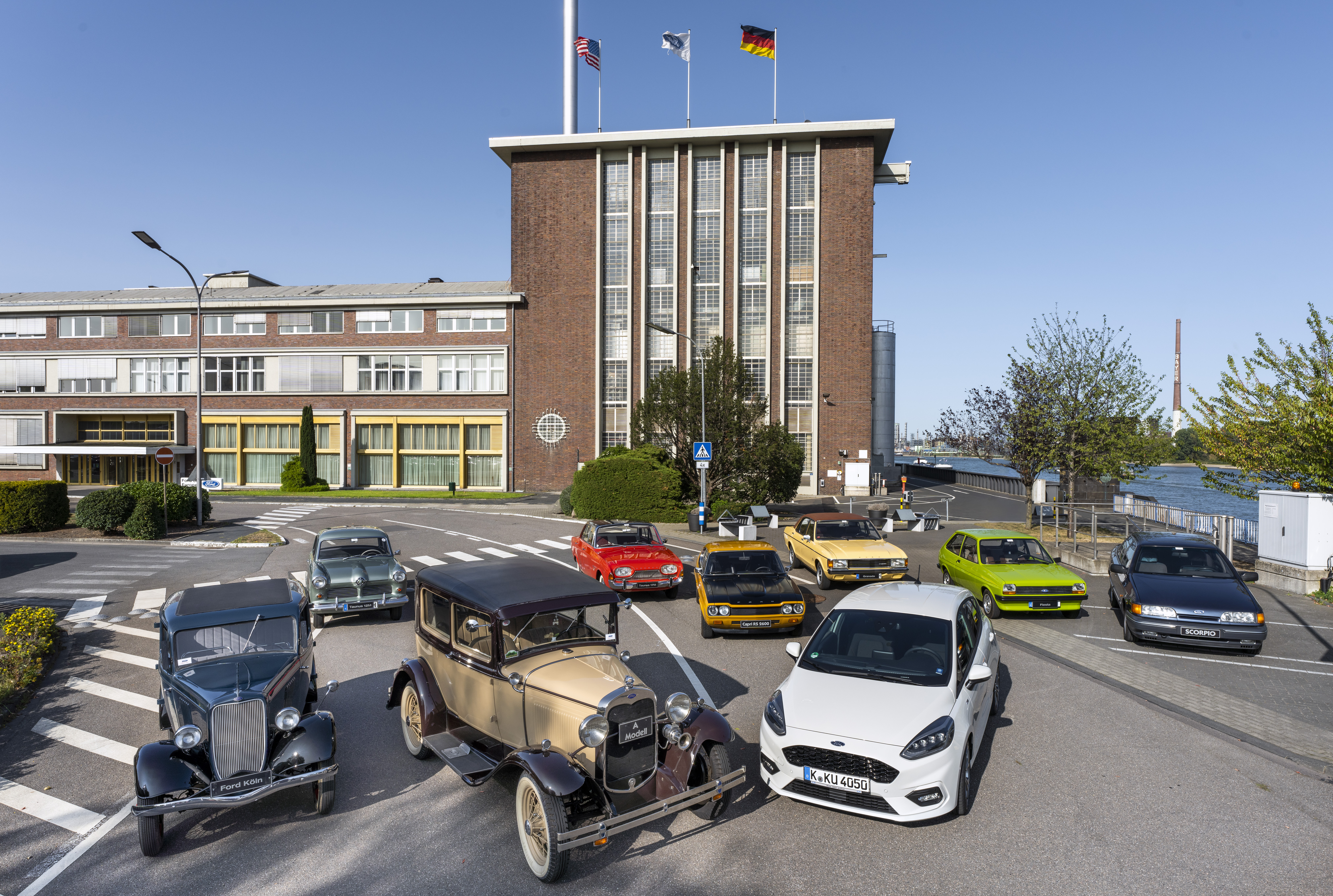 Ford-Werkjubiläum: Vor 90 Jahren beginnt Kölner Erfolgsgeschichte mit der Grundsteinlegung der Ford-Werke / Neun Meilensteine aus neun Jahrzehnten Ford in Köln: Ford "Köln" (Modell Y), Modell A, der aktuelle Ford Fiesta EcoBoost Hybrid (1. Reihe v.li.), "Weltkugel-Taunus", "Badewannen-Taunus", Capri I, Granada I, Fiesta I und Scorpio I (2. Reihe v.li.). / Weiterer Text über ots und www.presseportal.de/nr/6955 / Die Verwendung dieses Bildes ist für redaktionelle Zwecke honorarfrei. Veröffentlichung bitte unter Quellenangabe: "obs/Ford-Werke GmbH/Friedrich Stark"