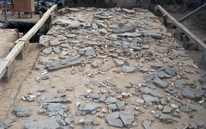 Ausgrabungen auf dem über 15.000 Jahre alten Fundplatz Gönnersdorf. Das Foto zeigt einen Ausschnitt aus der Grabungsfläche. Charakteristisch für Gönnersdorf ist die dichte Lage der vielen gravierten und ungravierten Schieferplatten Quelle: Foto: MONREPOS Archäologisches Forschungszentrum und Museum für menschliche Verhaltensevolution (idw)