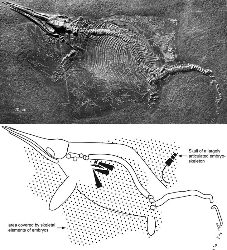 Nicht explodiert: Ichthyosaurier-Weibchen mit herausgespülten Embryonen, gefunden in Holzmaden (D). Quelle: Foto: UZH (idw)