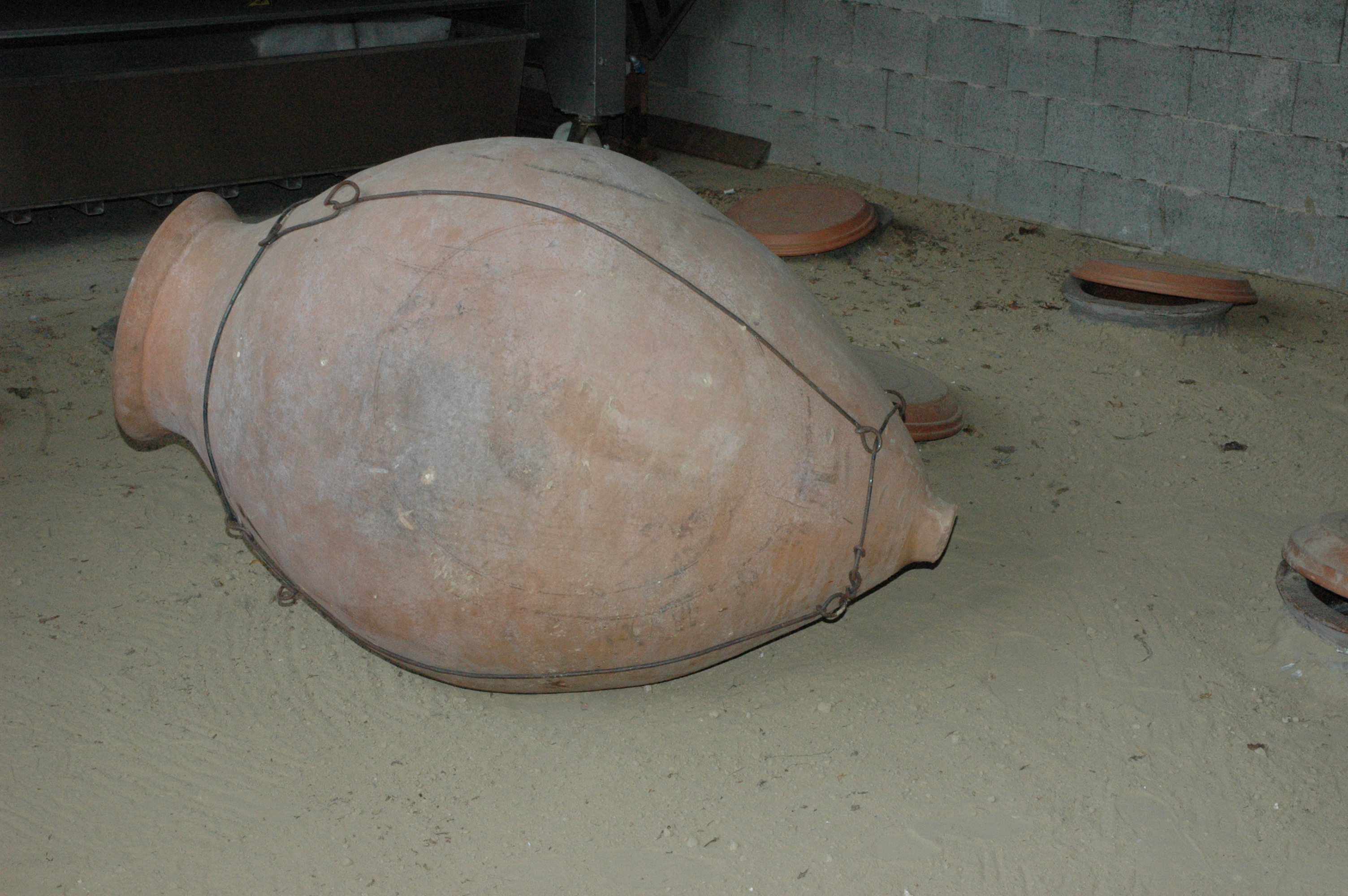 Im Vordergrund eine leere und im Hintergrund mehrere im Boden eingegrabene Tonamphoren (Quevri) zur Herstellung von Amphorenwein.