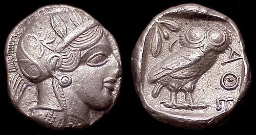 Tetradrachmon (nach 445 v. Chr.)Vorderseite: Kopf der AtheneRückseite: Eule mit Olivenzweig