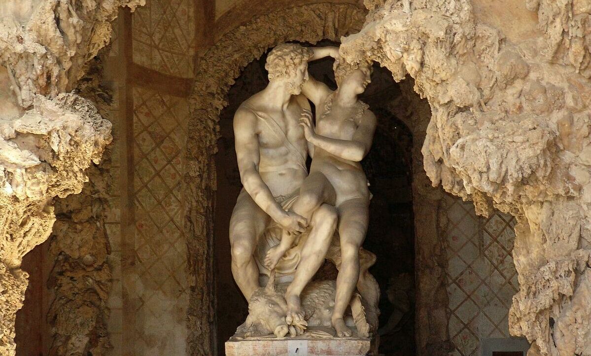 Paris beim Raub der Helena des italienischen Bildhauers Vincenzo de’ Rossi in der Grotta del Buontalenti im Boboli-Garten (Florenz, Italien)