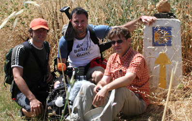 v.l.n.r.: Jan Frerichs, Kamran Safiarian, Ulrich Hansen - an einem Wegweiser mit dem Symbol des Jakobswegs, der Jakobsmuschel - auf der ersten Etappe von Leon nach Villar de Mazarife. Bild: ZDF und Jan Frerichs