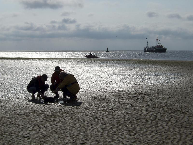 Dr. Dietmar Bürk, vom Helmholtz-Zentrum Geesthacht, Rainer Leive und Dr. Joachim Karig (von links) suchen im Frühjahr 2011 vor Ort im Wattenmeer bei Cuxhaven nach Spuren und Anhaltspunkten der genauen Position der hier gestrandeten "Gottfried". Bereits anhand der Beschaffenheit des Sandes können Rückschlüsse auf das Einsinken und Wandern von Strandgut im Grund gewonnen werden. Bild: ZDF und Friedrich Steinhardt
