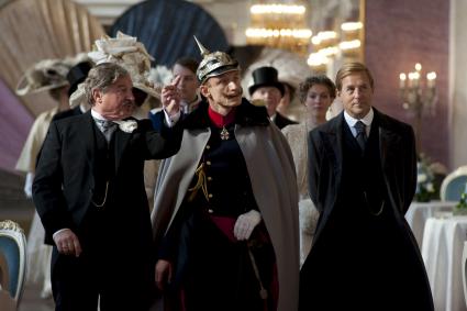 Lorenz (Burghard Klaußner, l.) und Louis Adlon (Heino Ferch, r.) führen Kaiser Willhelm II (Michael Schenk, m.) durch das neue Adlon. Bild: "obs/ZDF"